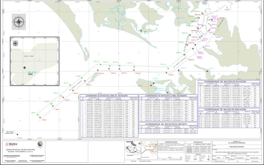 El puerto de Topolobampo, tiene un canal de navegación principal muy extenso el cual se