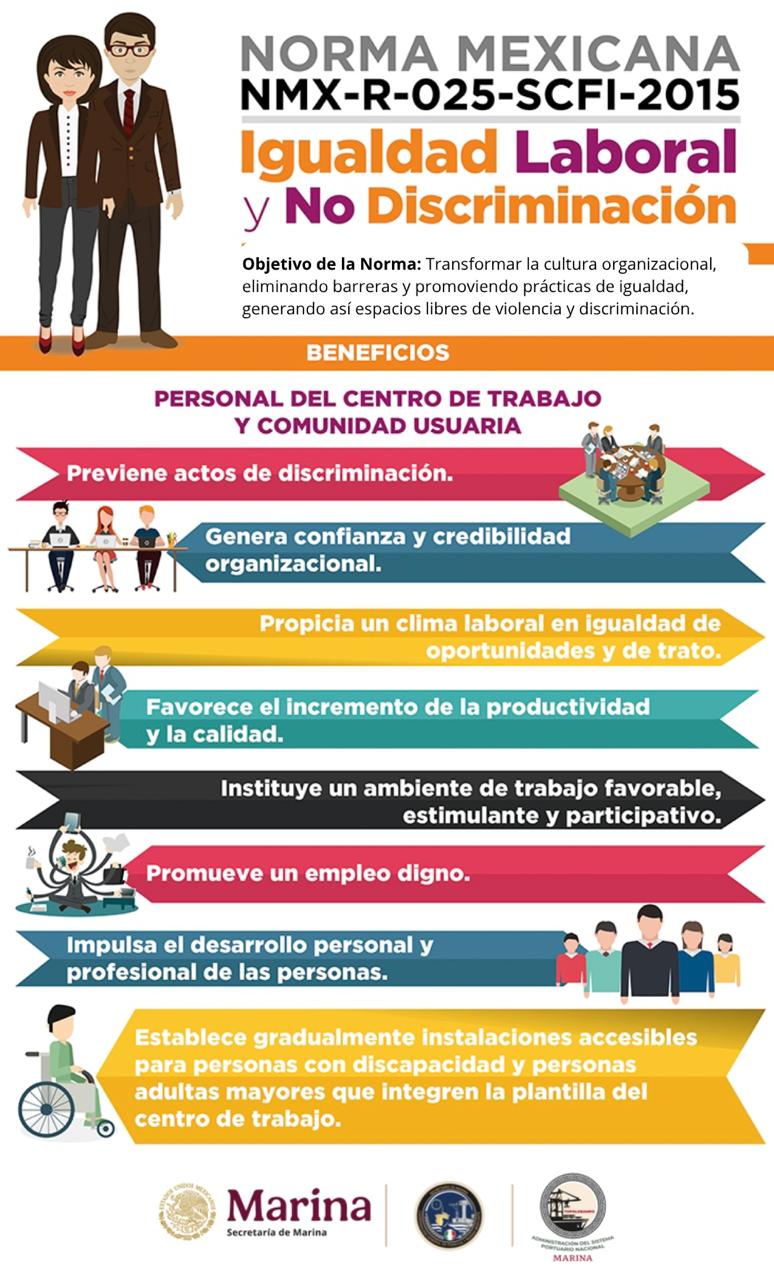 La Norma Mexicana NMX-R-025-SCFI-2015 en Igualdad Laboral y No Discriminación, es un mecanismo de adopción voluntaria para reconocer a los centros de trabajo que cuentan con prácticas en materia de igualdad laboral y no discriminación, para favorecer el desarrollo integral de su personal trabajador.